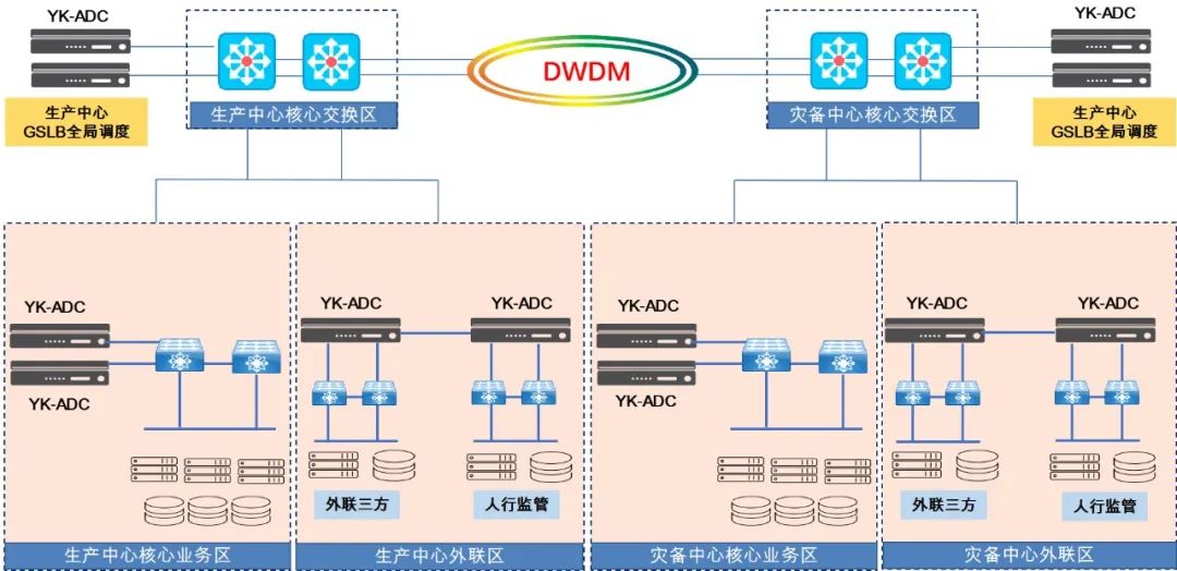 生產中心和災備中心為對稱部署,兩個中心使用波分技術實現互相連接;